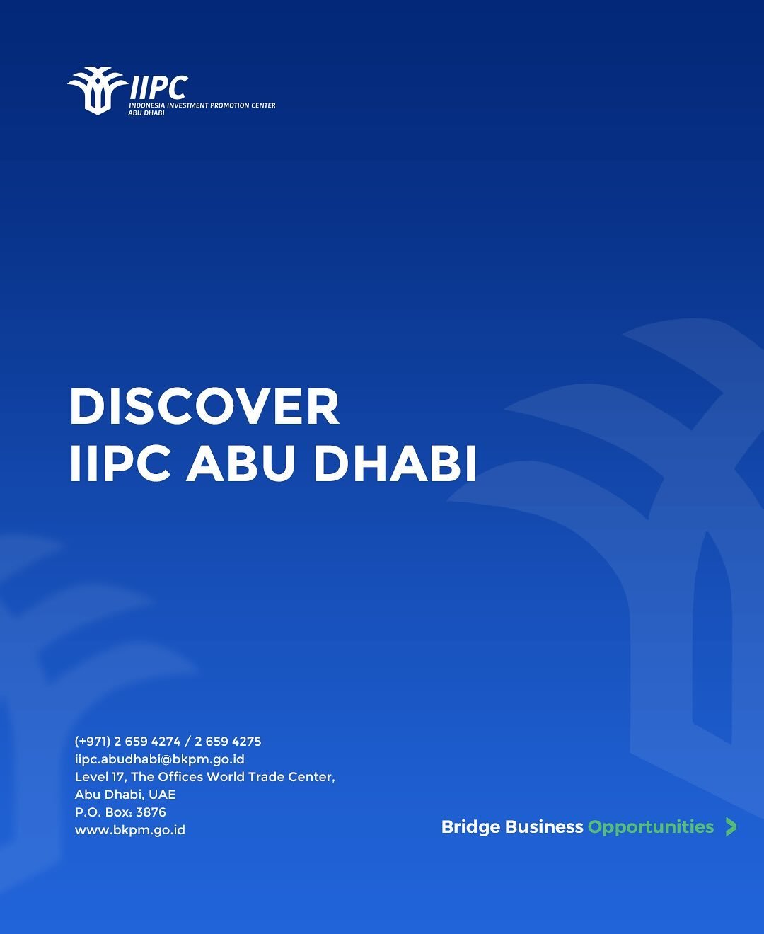 Indonesia Investment Promotion Center (IIPC) Abu Dhabi office is a government agency as the official Representative of the Ministry of Investment and Downstream Industries / Indonesia Investment Coordinating Board (BKPM)) for the entire in the Middle East, South Asia, Central Asia, and Africa Regions Middle East and African operations. It provides free consulting services on Indonesia investment opportunities, and procedures, and helps to find potential local partners for the investors.